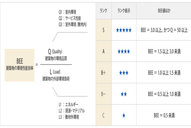 CASBEE®は、建物を環境性能で評価し格付けする手法であり、評価の概要は、Q値(建築物の環境品質・性能)を分子に、L値(建物が外部に与える環境負荷)を分母とする割合のBEE値(建築物の環境効率)によって、環境配慮に対する建物の特徴を多角的かつ総合的に数値化します。 また、BEE値の大小で5段階にランキングされます。