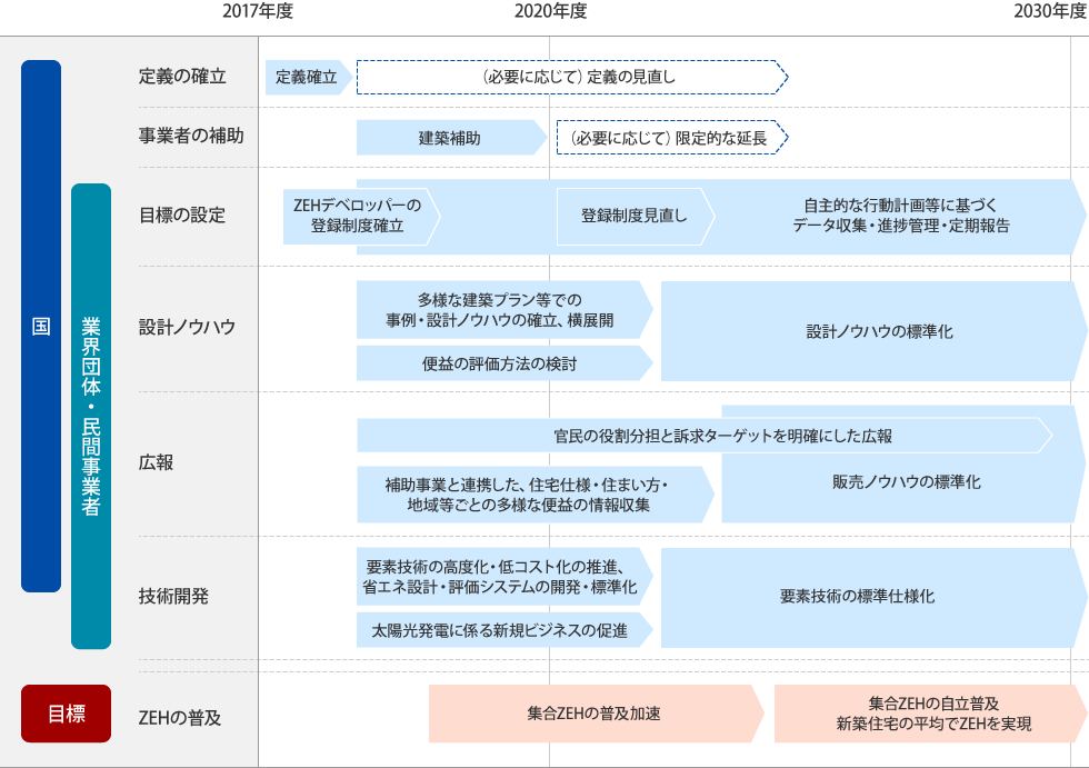 「エネルギー基本計画」(2014年4月閣議決定)において、「住宅については、2020年までに標準的な新築住宅で、2030年までに新築住宅の平均でZEHの実現を目指す」という政策目標に基づいたロードマップとなります。2018年から2020年まで建築補助を行い2030年までにZEH-Mの自立的普及を目指しています。
